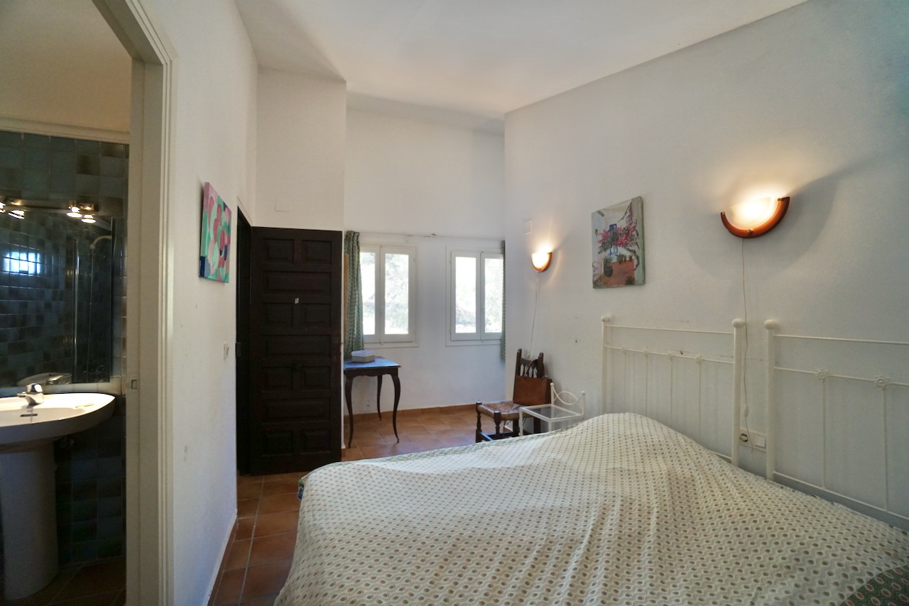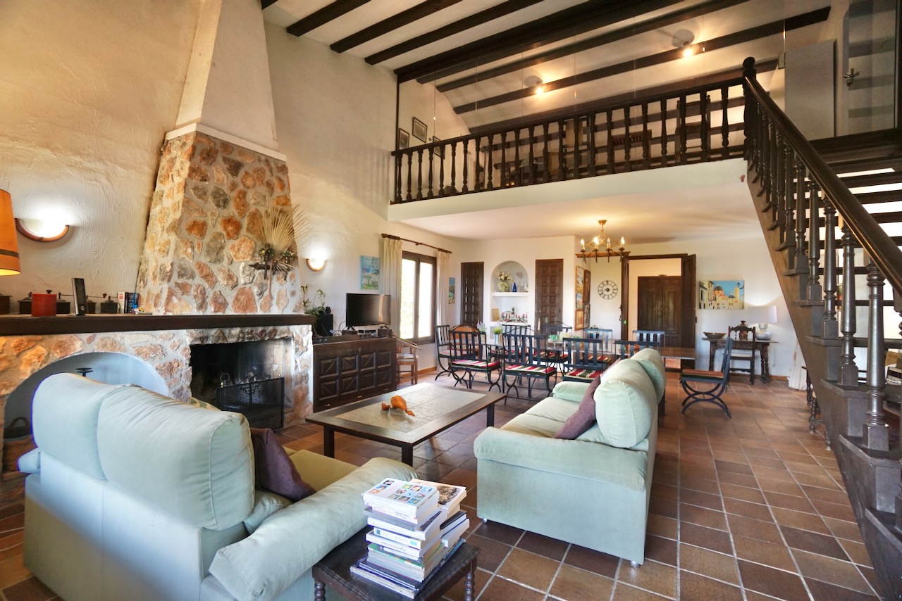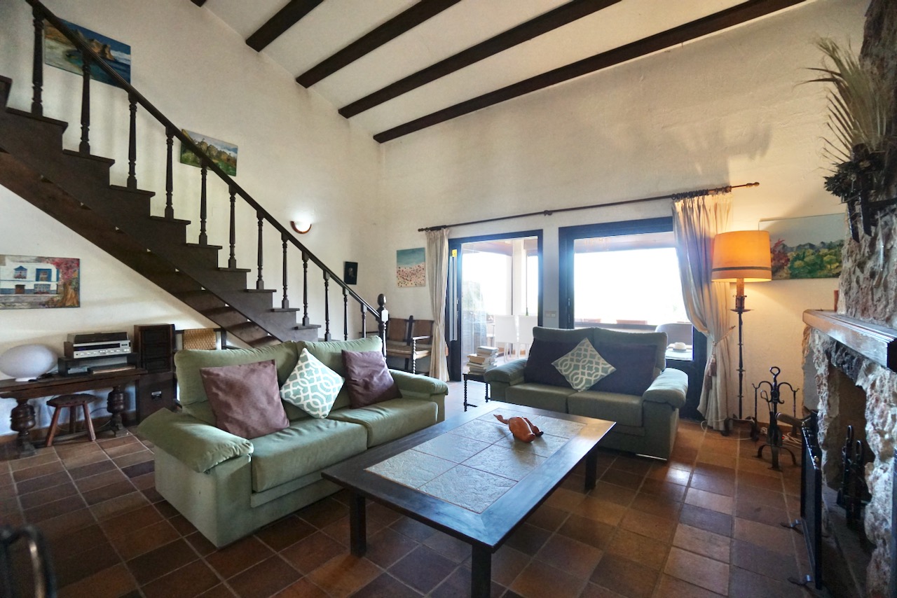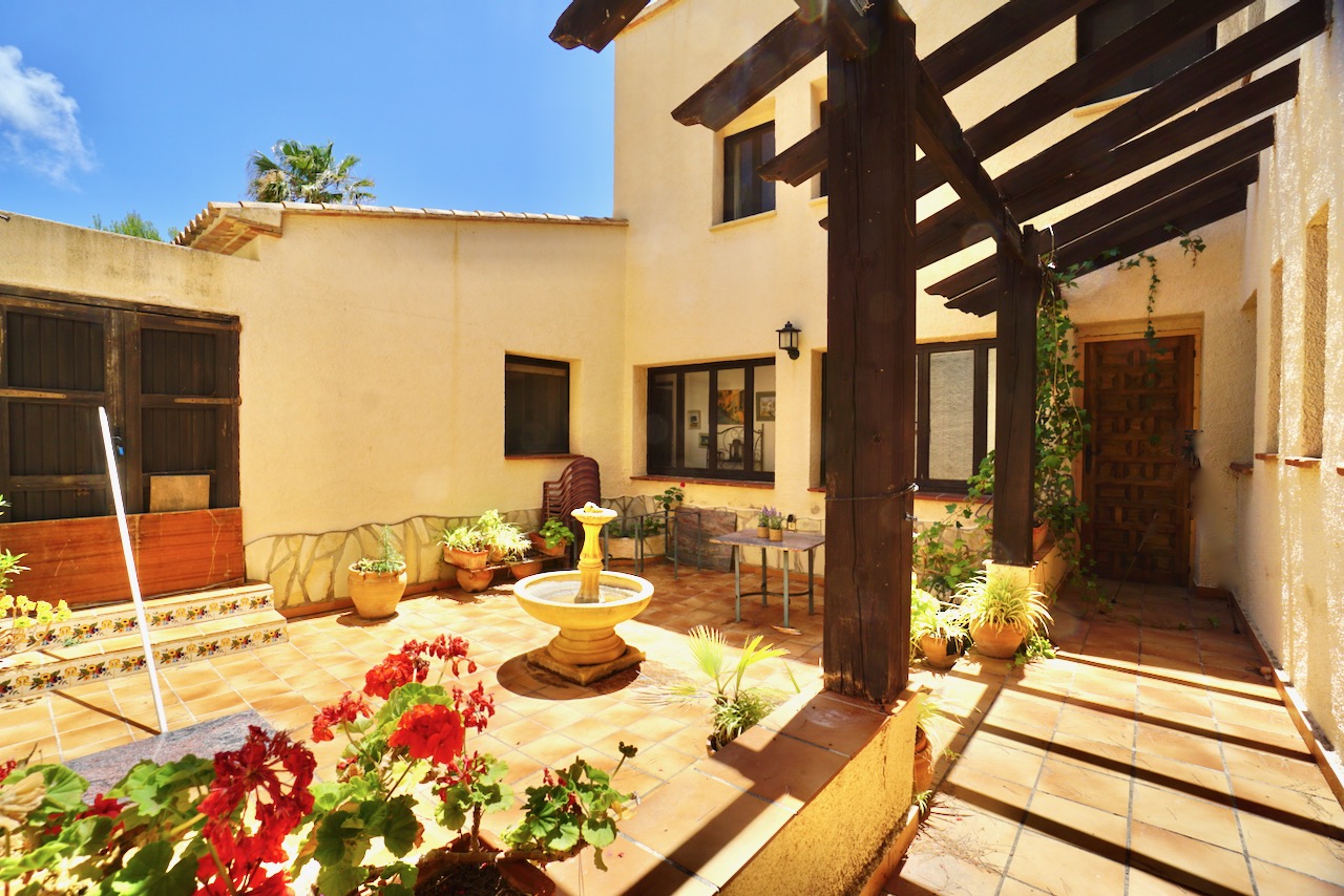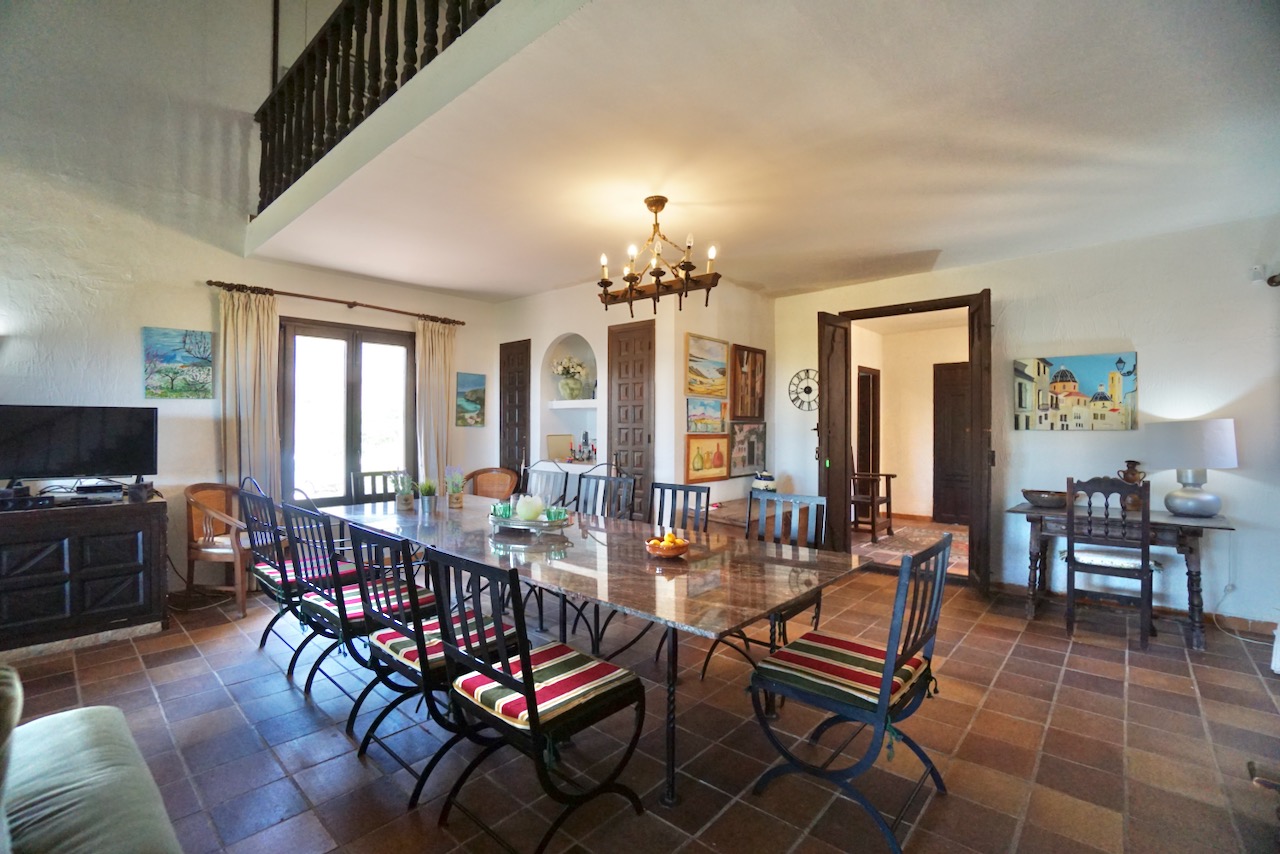 In an elevated location, here is a unique finca with beautiful views over the countryside all the way down to Calpe, the Mediterranean Sea and the Penon d’Ifach. The traditional town of Benissa is 5 minutes by car where there are plenty of amenities including a large weekly market, lots of shops and restaurants to sample. Heading to the coast, Calpe and its sandy blue flag beaches are only 6km away. The driveway leads to a parking area and a spacious garage for one car, plus lots of room for storage. The farm is set on a rustic plot of approximately 5000msq and surrounded by a lovely selection of mature trees and plants. There are fruit trees including figs, oranges and lemons plus palms and a pretty purple Jacaranda tree next to the house. From the parking area, we enter the farm through the wooden front door and into the reception room where there is a guest bathroom with toilet and also a storage room. To the left there is a door that provides internal access to the garage and there are also windows here that open to a beautiful internal courtyard. A cool place to retreat in the summer. From the reception, we step into the large open-plan dining and living room with double height ceilings. The room is full of character and very spacious with a large stone fireplace, wooden ceiling beams, a sofa area and a large dining table with chairs. Stairs up from living room take us to the upper mezzanine level. Here is a large room that could be used as an office space or a separate reading room. Also on this level there is a double bedroom with an ensuite bathroom. Back downstairs, the front of the lounge room has glass sliding doors that open to the Naya. The Naya is glazed-in but the panels can be opened so you can enjoy the sea views in comfort in Summer or Winter. This space can also be used for relaxing on sofas and for dining. There is a separate kitchen with a traditional wood burning oven adjacent to the lounge/dining room. From the kitchen, we step outside to the shaded dining and BBQ area next to the pool terrace, the perfect place for entertaining family and friends. Next to the kitchen there is a long central hallway providing access to the central courtyard, two storage cupboards, a utility/laundry room and four double bedrooms all with ensuite bathrooms and built-in wardrobes. Two of the bedrooms have lovely views over the pool to the beautiful Mediterranean Sea. The extra large pool is 12 x 6 m pool and surrounded by a spacious terrace with lots of room for relaxing on sun loungers. There is also a pool shower. With the property being south-facing, there is full sun all day and all year round. KEY FEATURES: Finca with 5 bedrooms all with ensuite bathrooms Beautiful sea views Stone Fireplace Surrounded by mature trees and fruit trees Internet and Satellite TV Extra large pool 12 x 6 m with pool shower & WC Garage Storage room & a utility room Built in wardrobes – all bedrooms Lovely Naya and outdoor BBQ area with sink This property is ready for renovation and has so much potential. Call us now to arrange a visit!