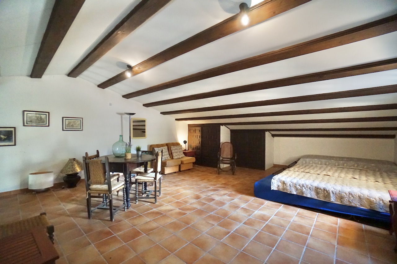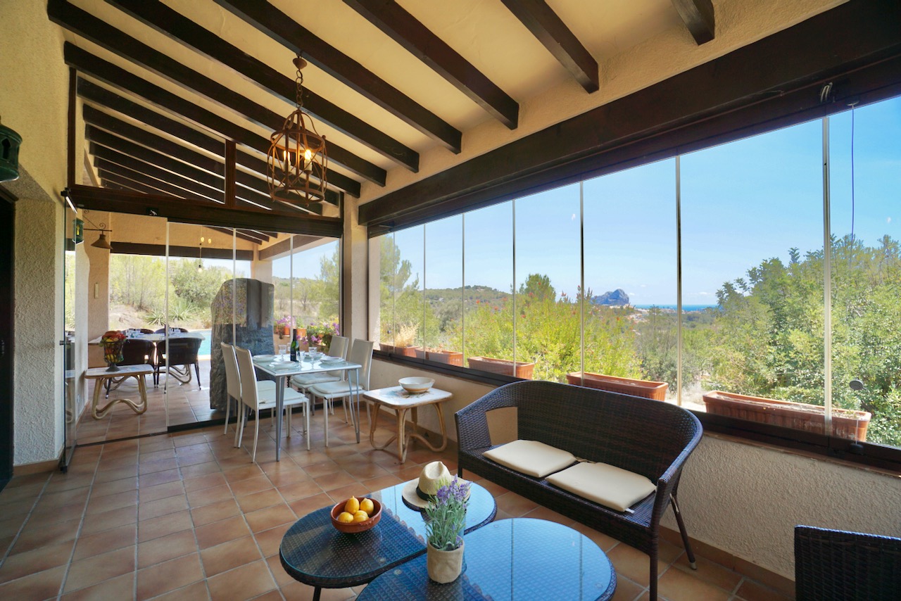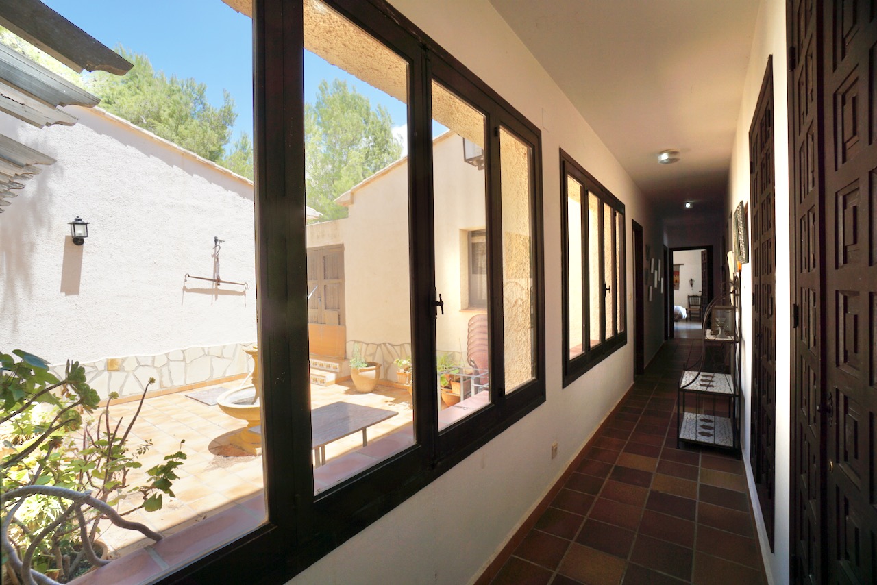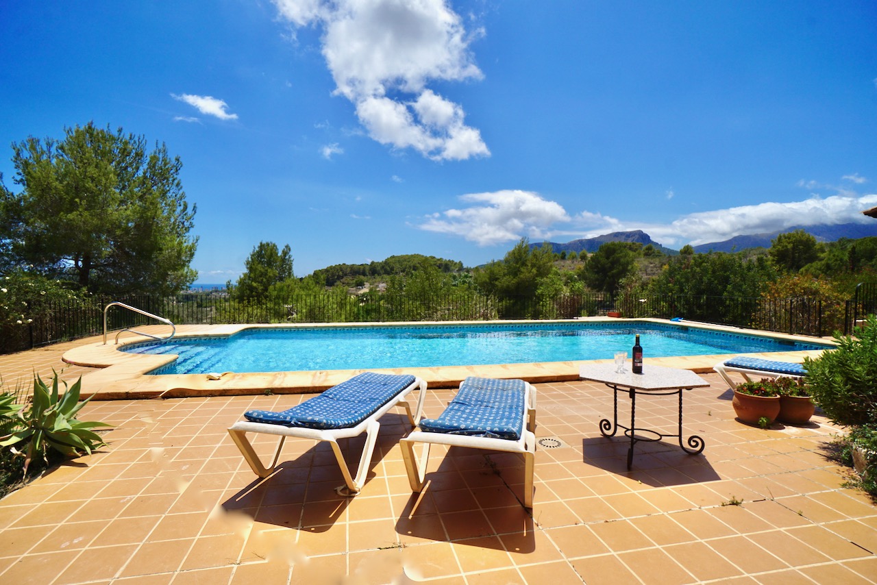 In an elevated location, here is a unique finca with beautiful views over the countryside all the way down to Calpe, the Mediterranean Sea and the Penon d’Ifach. The traditional town of Benissa is 5 minutes by car where there are plenty of amenities including a large weekly market, lots of shops and restaurants to sample. Heading to the coast, Calpe and its sandy blue flag beaches are only 6km away. The driveway leads to a parking area and a spacious garage for one car, plus lots of room for storage. The farm is set on a rustic plot of approximately 5000msq and surrounded by a lovely selection of mature trees and plants. There are fruit trees including figs, oranges and lemons plus palms and a pretty purple Jacaranda tree next to the house. From the parking area, we enter the farm through the wooden front door and into the reception room where there is a guest bathroom with toilet and also a storage room. To the left there is a door that provides internal access to the garage and there are also windows here that open to a beautiful internal courtyard. A cool place to retreat in the summer. From the reception, we step into the large open-plan dining and living room with double height ceilings. The room is full of character and very spacious with a large stone fireplace, wooden ceiling beams, a sofa area and a large dining table with chairs. Stairs up from living room take us to the upper mezzanine level. Here is a large room that could be used as an office space or a separate reading room. Also on this level there is a double bedroom with an ensuite bathroom. Back downstairs, the front of the lounge room has glass sliding doors that open to the Naya. The Naya is glazed-in but the panels can be opened so you can enjoy the sea views in comfort in Summer or Winter. This space can also be used for relaxing on sofas and for dining. There is a separate kitchen with a traditional wood burning oven adjacent to the lounge/dining room. From the kitchen, we step outside to the shaded dining and BBQ area next to the pool terrace, the perfect place for entertaining family and friends. Next to the kitchen there is a long central hallway providing access to the central courtyard, two storage cupboards, a utility/laundry room and four double bedrooms all with ensuite bathrooms and built-in wardrobes. Two of the bedrooms have lovely views over the pool to the beautiful Mediterranean Sea. The extra large pool is 12 x 6 m pool and surrounded by a spacious terrace with lots of room for relaxing on sun loungers. There is also a pool shower. With the property being south-facing, there is full sun all day and all year round. KEY FEATURES: Finca with 5 bedrooms all with ensuite bathrooms Beautiful sea views Stone Fireplace Surrounded by mature trees and fruit trees Internet and Satellite TV Extra large pool 12 x 6 m with pool shower & WC Garage Storage room & a utility room Built in wardrobes – all bedrooms Lovely Naya and outdoor BBQ area with sink This property is ready for renovation and has so much potential. Call us now to arrange a visit!